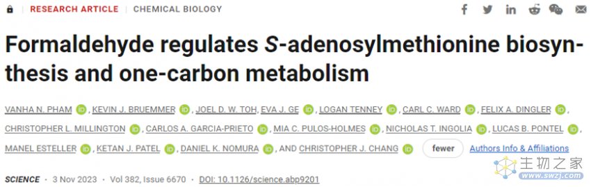 在一项新的研究中,西班牙约瑟夫-卡雷拉斯白血病研究所主任、巴塞罗那大学遗传学系主任Manel Esteller 博士和约瑟夫-卡雷拉斯白血病研究所研究员 Lucas Pontel 博士以及美国加州大学伯克利分校的 Christopher J. Chang 博士及其研究团队证实作为一种常见于各种家用产品和化妆品、污染空气中并广泛用于建筑业的物质,甲醛对正常的表观遗传模式具有强大的修饰作用。相关研究结果发表在2023年11月3日的Science期刊上,论文标题为“Formaldehyde regulates S-adenosylmethionine biosynthesis and one-carbon metabolism”。