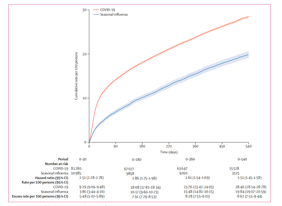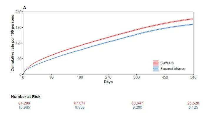 他们在分析了9万多人的18个月随访数据后发现,需要住院的新冠感染者和季节性流感患者,他们的死亡、再入院,以及多器官后遗症的风险在感染的18个月内都是增加的。只不过相比于季节性流感,新冠感染者的死亡、再入院风险和多器官后遗症的风险要更高。