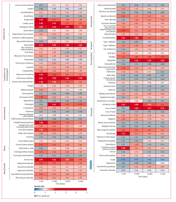 最后,在后遗症的发生风险上,在整个随访期间,新冠感染者与其中64种(68.1%)后遗症风险增加有关,主要涉及12种心血管系统疾病、5种凝血和血液系统疾病、1种疲劳相关问题、9种胃肠道系统疾病、4种肾脏系统疾病、14种心理健康相关疾病、 2种代谢系统疾病、3种肌肉骨骼系统疾病、13种神经系统疾病,以及1种肺部疾病。