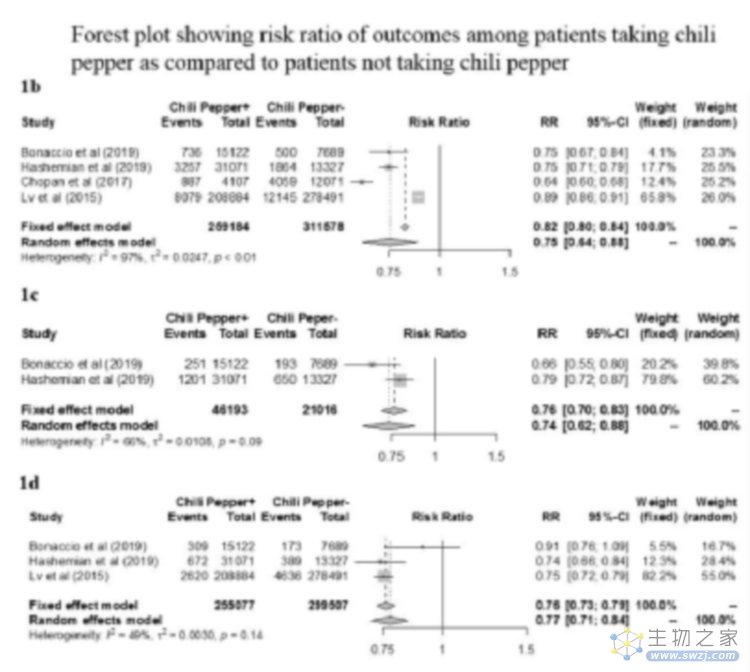 随机效应汇总分析显示,与少吃或不吃辣椒的人相比,吃辣椒的人全因死亡率相对风险降低了25%( RR: 0.75; 95% CI: 0.64-0.88, p = 0.0004);心血管病死亡率相对风险降低了26%(RR: 0.74; 95% CI: 0.62-0.88, p=0.0006);癌症死亡率相对风险降低了23%(RR: 0.77; 95% CI: 0.71-0.84, p=0.0001);对脑血管意外的影响并无统计学差异(RR: 0.76; 95%CI:0.36-1.60,p = 0.47)。