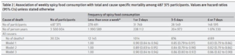 纳入分析的4个研究里,有一个来自北京大学研究团队的前瞻性队列研究(10个不同地区、近50万人)。7.2年随访发现,与每周吃辣食物少于1次的人相比,即使每周只有1到2天吃辣,也能观察的有益效果;如果每周吃6或7次,全因死亡风险将降低14%,缺血性心脏病死亡风险降低22%。