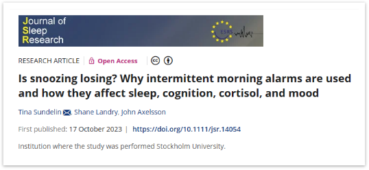 [1] Sundelin T, Landry S, Axelsson J. Is snoozing losing? Why intermittent morning alarms are used and how they affect sleep, cognition, cortisol, and mood. J Sleep Res. 2023 Oct 17:e14054.