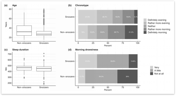 研究人员将报告早起贪睡的受试者(贪睡者,n=1195)与早起使用闹钟但“从不”贪睡的受试者(不贪睡者,n=287)进行比较,结果发现,贪睡者比不贪睡者平均年龄小6岁,前者成为“夜猫子”的可能性是后者的4倍。与不贪睡者相比,贪睡者在工作日的睡眠时间平均少13分钟,休息日的睡眠时间未发现显著差异。