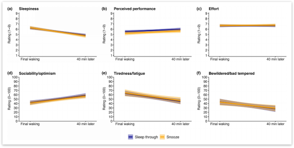 情绪评分方面,醒来40分钟后受试者更善于交际和乐观,不那么疲劳和脾气暴躁,同样,未发现贪睡对任何情绪评级的影响。