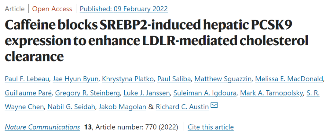 2024-03-06 15:27:54 来源:生物世界加拿大麦克马斯特大学的研究人员在 Nature 子刊 Nature Communications 期刊发表了题为:Caffeine blocks SREBP2-induced hepatic PCSK9 expression to enhance LDLR-mediated cholesterol clearance 的研究论文。