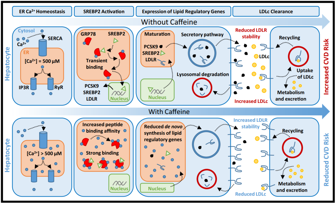 进一步机制研究显示,咖啡因增加了肝细胞内质网钙离子水平,从而阻断了 SREBP2 的激活,进而降低了 PCSK9 表达水平,增加了低密度脂蛋白受体(LDLR)的表达,促进了低密度脂蛋白胆固醇(LDLc)的清除。