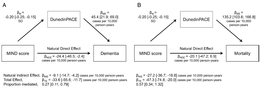 研究人员表示,测试多系统生物衰老是饮食与痴呆之间潜在关联机制的假设是合乎逻辑的,研究表明,坚持MIND饮食可以减缓衰老速度,并降低痴呆和死亡风险。衰老速度减慢在一定程度上介导了健康饮食与痴呆风险降低之间的关系,因此,监测衰老速度可能有助于预防痴呆。