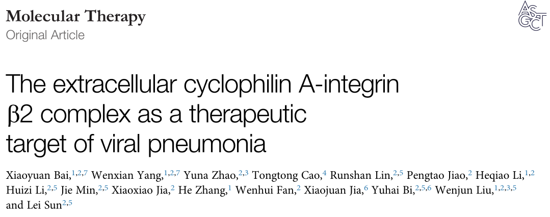 Molecular Therapy:细胞外亲环素A-整合素b2复合体作为病毒性肺炎的治疗靶点