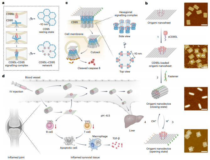 设计的DNA折纸在中性条件下保持闭合构型,在弱酸性环境下转变为开放构型,以暴露CD95L阵列的六边形图案。这一特征极大地增强了炎症滑膜组织(pH ~6.5)中活化免疫细胞中CD95诱导死亡信号的选择性激活,同时保留了肝脏中表达低水平CD95受体的健康肝细胞 (pH ~7.4),从而最大限度地减少了肝毒性。该研究证明,在胶原诱导关节炎(CIA)小鼠模型中,局部消融炎症滑膜组织中的免疫细胞可显著缓解慢性炎症,促进局部免疫耐受,改善关节损伤,且无明显副作用。