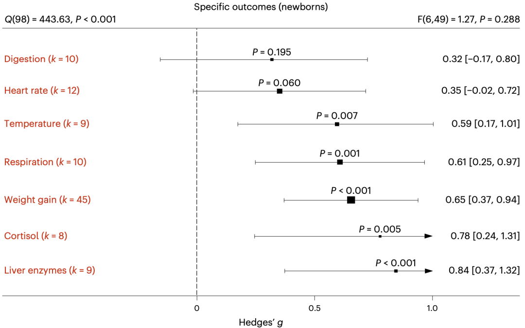 在新生儿中,Packheiser团队没有发现触摸对消化和心率参数有任何益处,但触摸对皮质醇、肝酶、呼吸、体温调节和体重增加都显示出中等到较大的影响。