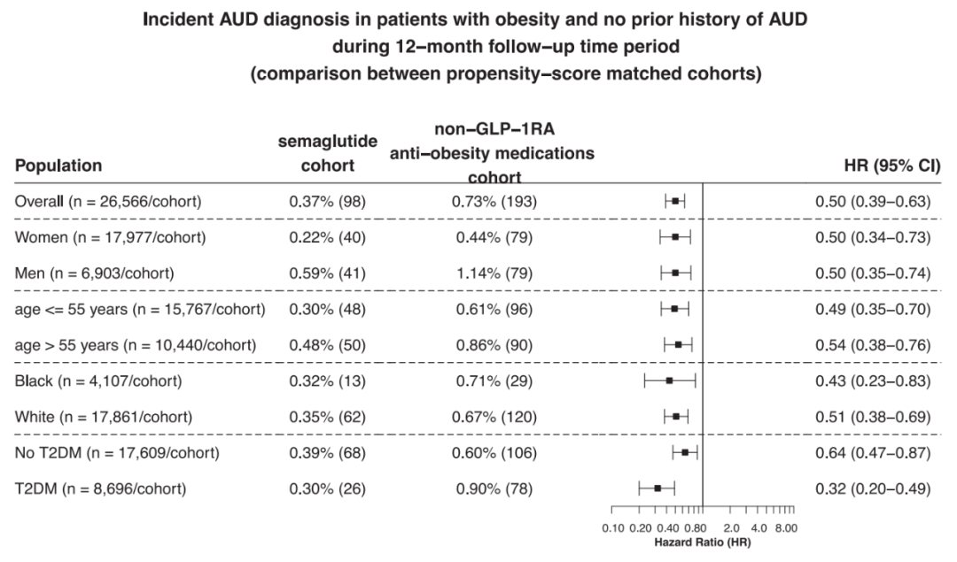 在这项最新研究中,研究团队分析了83825名肥胖患者的电子健康记录,结果显示,与接受其他减肥药物治疗的患者相比,接受司美格鲁肽治疗的患者在接下来的一年中,酒精使用障碍的发生和复发均减少了50%-56%。在按性别、年龄组、种族分层的患者中,以及在患和未患2型糖尿病的患者中,均观察到一致的减少。此外,研究团队还在包含598803名2型糖尿病患者的研究人群中观察到了类似的结果。
