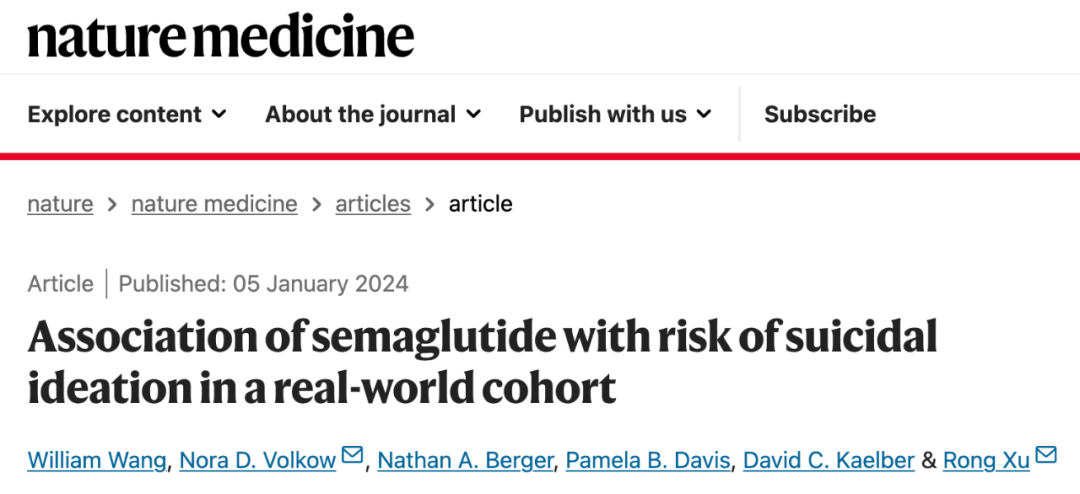 今年1月份,该团队在 Nature Medicine 期刊发表了题为:Association of semaglutide with risk of suicidal ideations in a real-world cohort 的研究论文【3】。该研究显示,司美格鲁肽的使用与自杀念头的增加无关,实际上还降低了自杀念头。