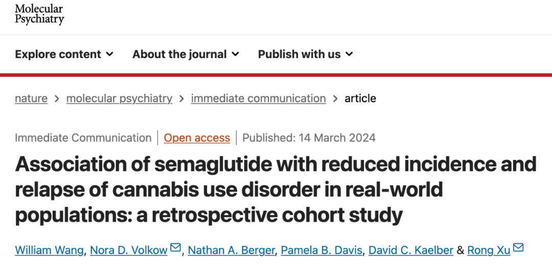 今年3月份,该团队在 Molecular Psychiatry 期刊发表了题为:Association of semaglutide with reduced incidence and relapse of cannabis use disorder in real-world populations: a retrospective cohort study 的研究论文【4】。该研究显示,司美格鲁肽与减少大麻使用障碍的发生和复发有关。