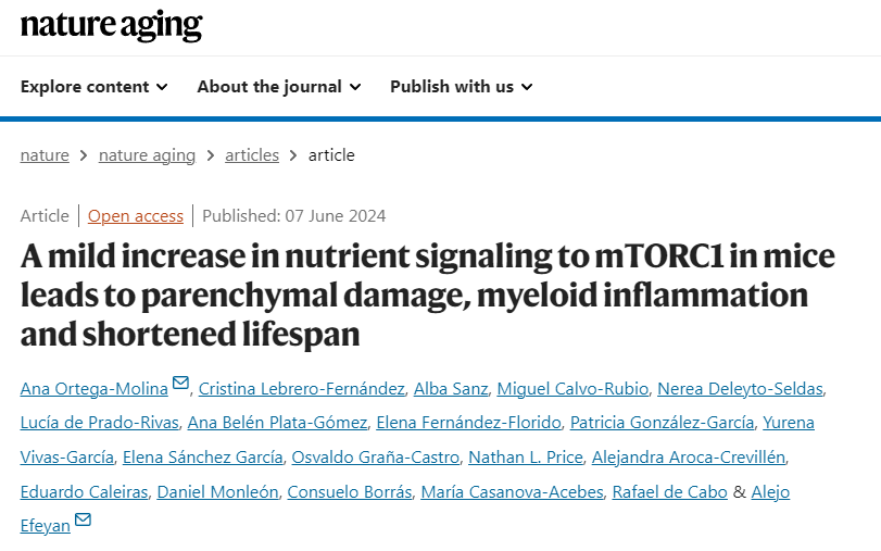 1417-10-20 17:19:00 来源:医诺维西班牙国家癌症研究中心的研究人员在" Nature Aging "期刊上发表了一篇题为" A mild increase in nutrient signaling to mTORC1 in mice leads to parenchymal damage,myeloid inflammation and shortened lifespan "的研究论文。