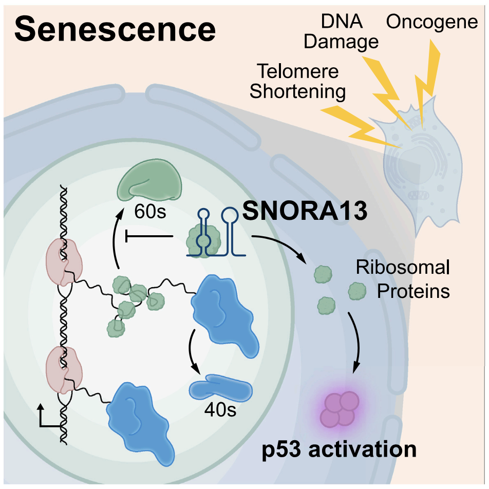 SNORA13的功能一是指导18S rRNA的假尿嘧啶化,这是它的常见功能;二是通过新机制调控60S核糖体亚基的生物合成和细胞衰老,这种机制独立于其对18S rRNA的修饰作用。即使SNORA13的突变体失去了指导假尿嘧啶化的能力,它们仍能在敲除细胞中减缓衰老并调节60S核糖体亚基的丰度至野生型水平。通过反义寡核苷酸纯化及质谱分析、紫外线交联和RNA免疫沉淀等方法,发现SNORA13直接与核糖体蛋白大核糖体亚基组分RPL23相互作用,这种相互作用在核糖体亚基外发生,SNORA13能够竞争性地抑制RPL23与28S rRNA的结合,减缓60S亚基的生物合成速率。因此,SNORA13通过负调控核糖体生物合成,在致癌应激条件下激活核仁应激反应。
