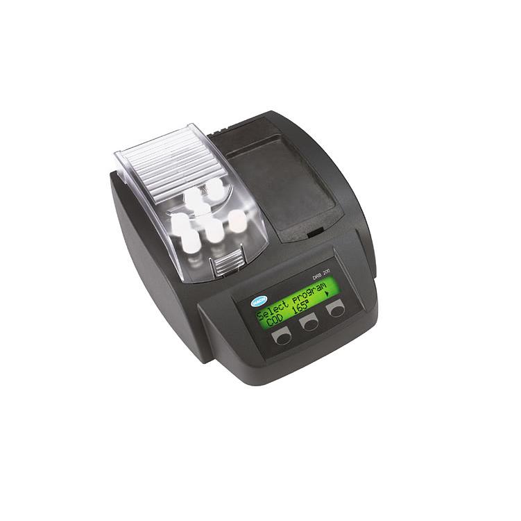 其主要特点在于: ● 无需配制试剂:COD测试所需的化学组份按一定比例制备而成的预制试剂管可大大节省试剂配制所需时间; ● 省时:整个测定过程 包括水样的消解、比色测定等步骤所需时间不足3小时; ● 紧凑的消解装置:哈希公司开发的COD消解器替代了传统COD回流装置 可同时消解多达25个水样; ● 对环境产生的二次污染小:微回流法只需要少量试剂精心设计的试剂管可防止有机物的挥发以及样品的逸出 确保了消解过程的安全性; ● 操作简单、易学:图文并茂的操作指南便于在较短时间内掌握COD的分析方法。 1.COD微回流法分析步骤: 第一步:试剂、水样的准备过程每支COD试剂管中有3mL试剂 拧开瓶盖后 加入2mL水样 拧紧瓶盖(当使用0―15000mg/L的COD试剂管时只需加入0.2mL 的水样)。 第二步:水样消解过 将装有水样的COD试管放入COD消解器中 150℃的条件下加热回流小时后 消解过程结束COD消解器自动关闭。COD消解器中取出COD试剂管 冷却至室温。 第三步:COD比色法测定 开启比色计或分光光度计 进入COD测试程序无需建立标准曲线 只需将试剂管放入仪器中即可读出以浓度单位表示的COD值 记录实验结果。 2.COD分析系统 哈希公司可提供COD微回流法的分析系统包括消解器、分光光度计以及配套试剂等。 2.1 DRB200消解器 表4 DRB200产品类型及订货号